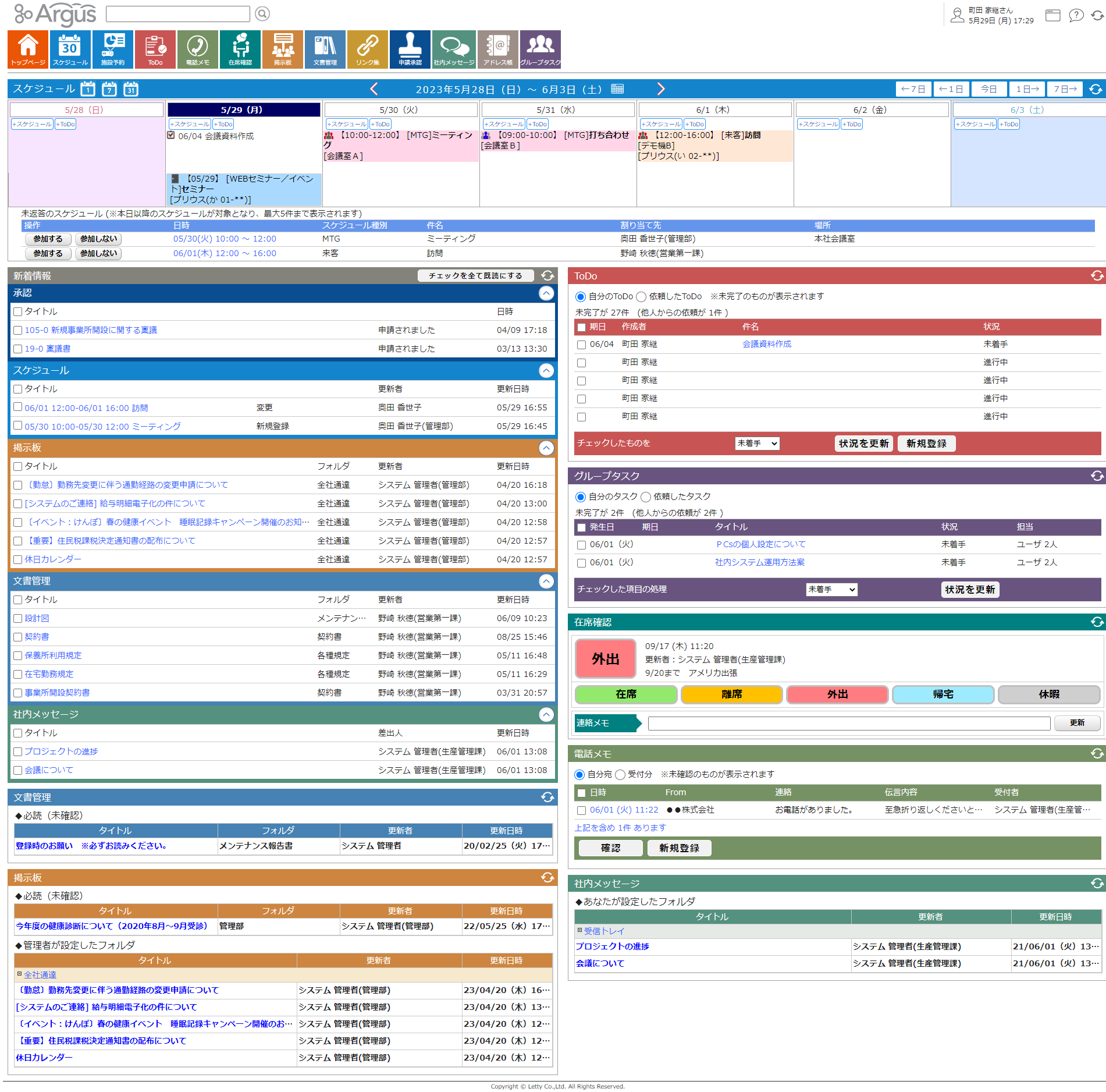 利用者名と現在日時を表示します。また、以下のポートレットは画面「管理者メニュー ポートレットの配置設定」又は「ユーザーメニュー ポートレット配置の編集」で設定することができます。 |